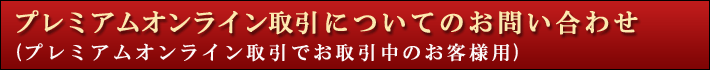 現在、プレミアムオンライン取引にお取引口座をお持ちのお客様に、プレミアムのサービス内容等の質問や再度確認しておきたい事など、様々なご質問にお答え致します。 また、相場情報についてもお答え致しますので、下記お問い合わせフォームに必要事項をご入力頂きご返信下さい。お客様よりお問い合わせ頂いた内容は、電子メールにてご返答させて頂きます。(お電話でのご返答をご希望の方は、その旨をご入力下さい。) また、お電話でのお問い合わせも受付けておりますので、お気軽にご連絡下さい。