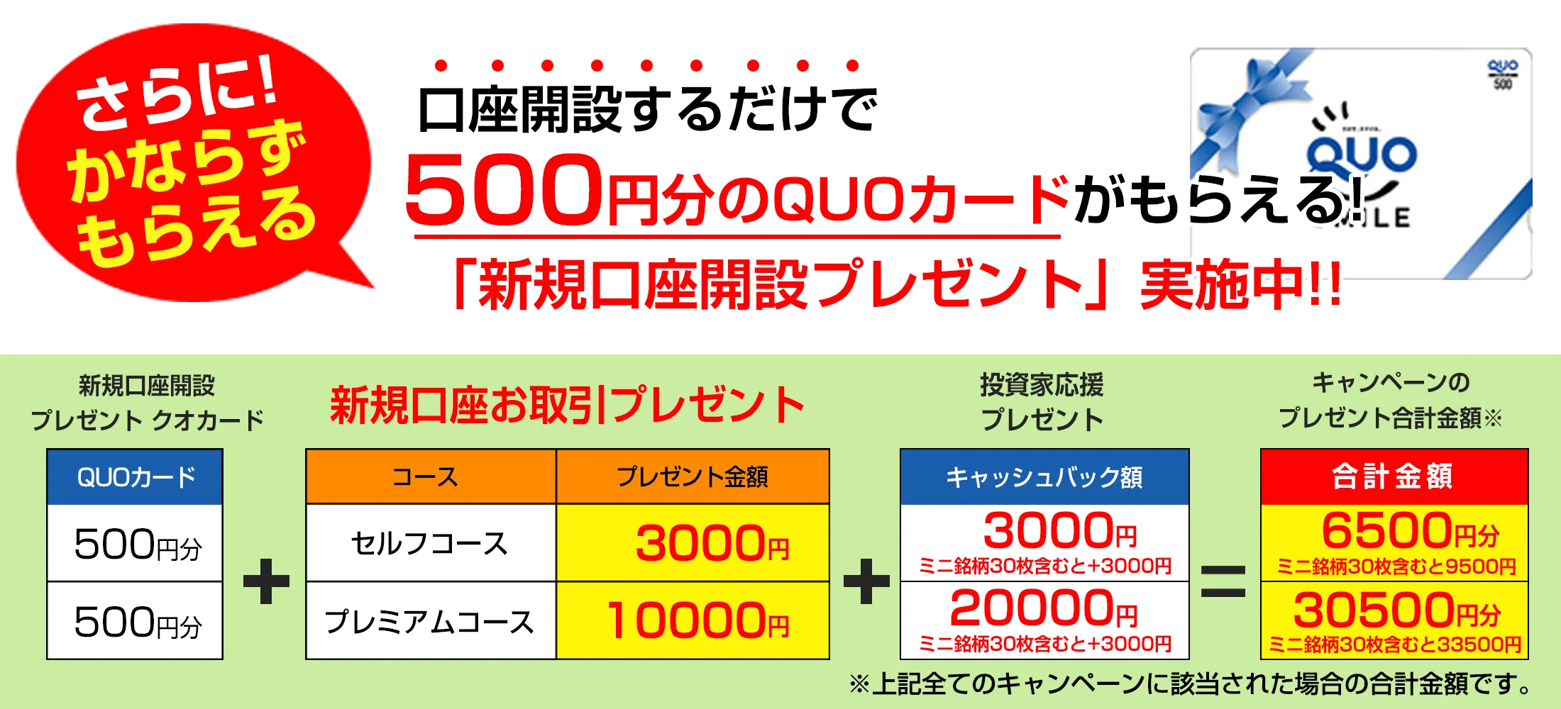 | キャンペーン特典 | 口座開設していただいたコースに応じてプレゼントいたします。 セルフコースに口座開設をしていただき、対象銘柄を1枚以上建玉していただくと3,000円を、プレミアムコースに口座開設をしていただき、対象銘柄を1枚以上建玉していただいた場合は5,000円をもれなくプレゼントいたします。 |