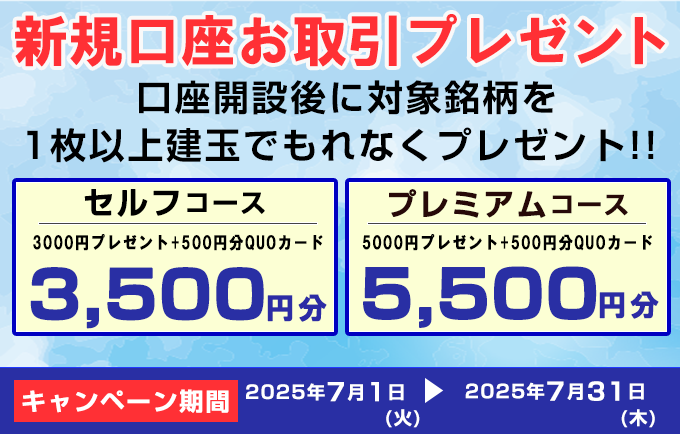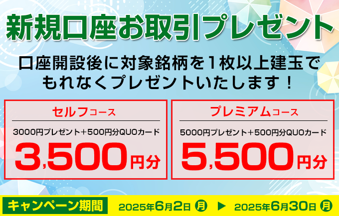 キャンペーン期間中に初回のご入金をいただき、且つお取引期限内に対象銘柄を1枚以上(※)建玉していただいたお客様に、セルフコースは3000円、プレミアムオンライン取引は5,000円をもれなくプレゼントいたします!!