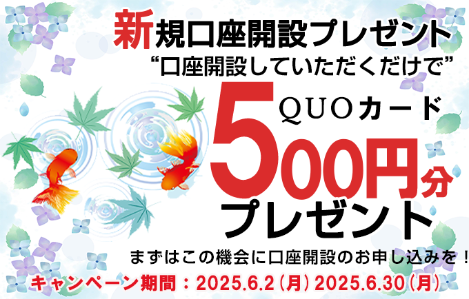 キャンペーン期間中に新規口座開設手続きを完了されたお客様に、500円分のQUOカードをプレゼントさせていただきます。