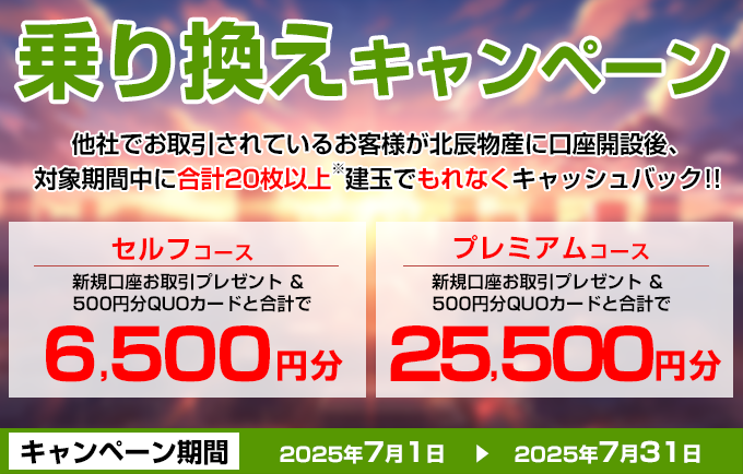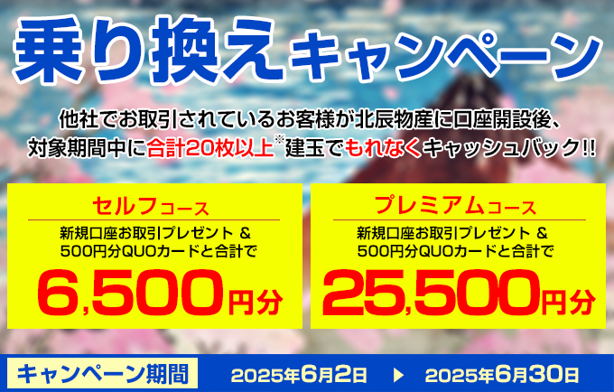 過去に北辰物産オンライン取引「D-station」でのお取引経験があり、取引口座残高が0円のまま1年以上を経過されているお客様で、キャンペーン期間中に新たに口座開設をされた方を対象に、キャンペーン期間中に初回のご入金を頂き、且つお取引期限内に対象銘柄を合計1枚以上(※)建玉して頂くと、セルフコースは現金2,000円、プレミアムオンライン取引は4,000円をもれなくキャッシュバックいたします!!