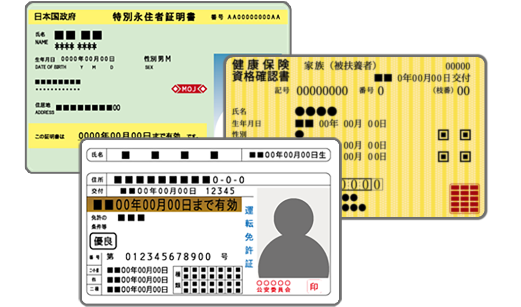 - 顔写真付きの書類につきましては、必ず顔写真部分や有効期限が鮮明に確認できる状態でお送りください。