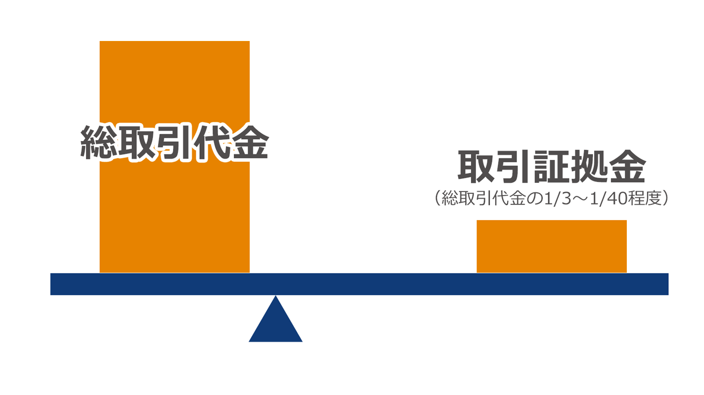 商品先物取引は、総約定代金のおおよそ3~30%程度の少ない資金で取引することができ、これをレバレッジ(てこ)効果と呼びます。