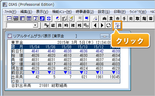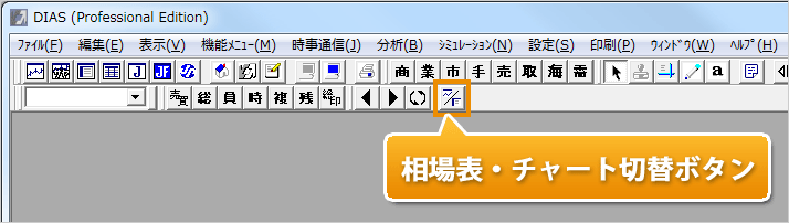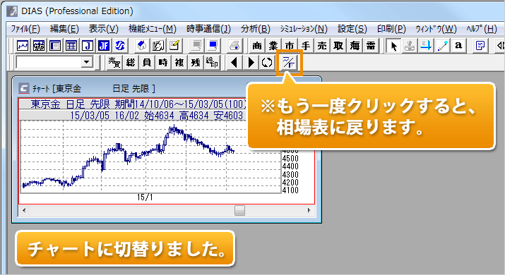相場表もしくはチャートを表示した後、相場表とチャートの切替を行います。