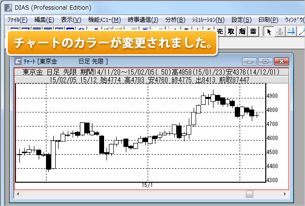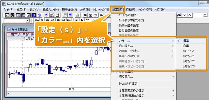 「DIAS(Pro)」は、背景色やローソク足など個別に色を設定し、その組合せを登録する事が可能です。