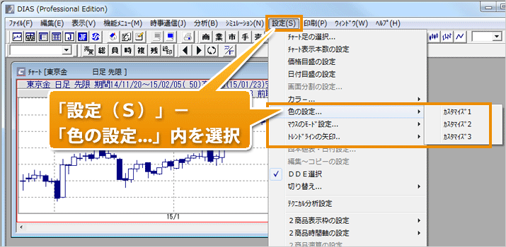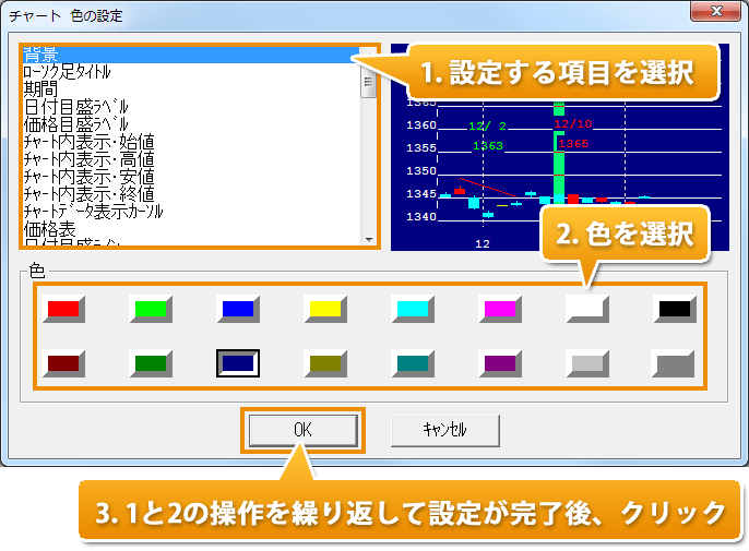 チャートカラーのカスタマイズ変更 背景やローソク足の色など、個別に色を設定します。 STEP 1 チャートの表示方法についてはこちら STEP 2 STEP 3 ここで設定したカスタマイズ1~3を適応するには、こちら カラー対応表(通常)は、こちら カラー対応表(テクニカル分析)は、こちら
