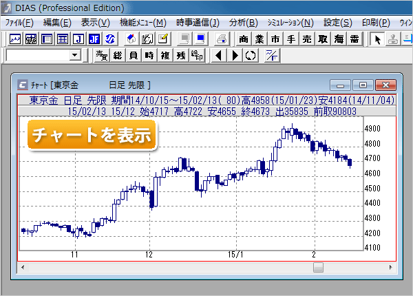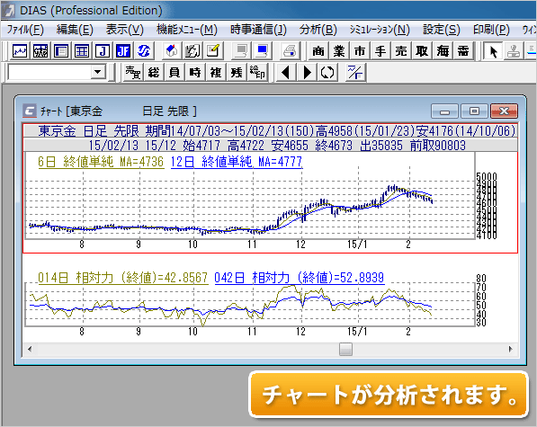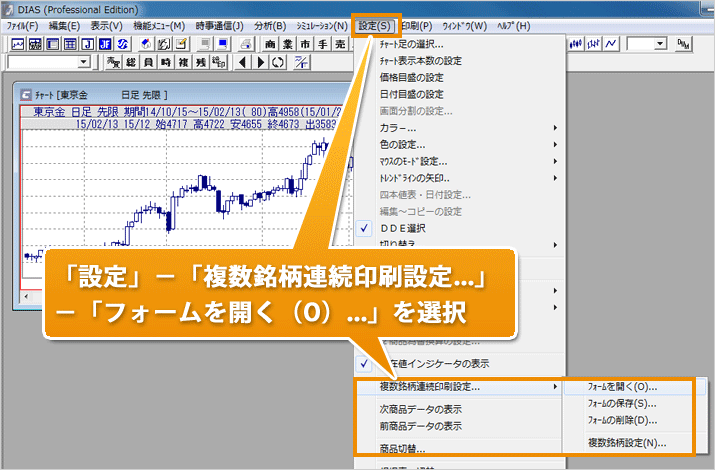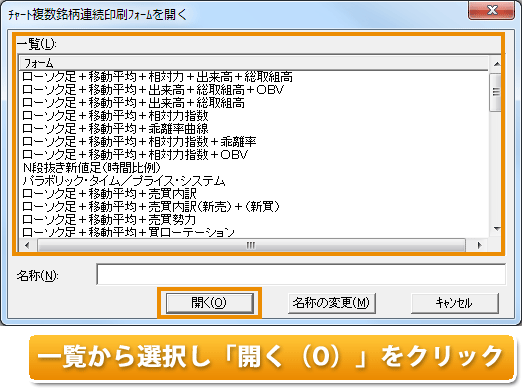 「フォームの保存」で保存したテクニカル分析の組合せ(フォーム)を、表示しているチャート上に表示します。