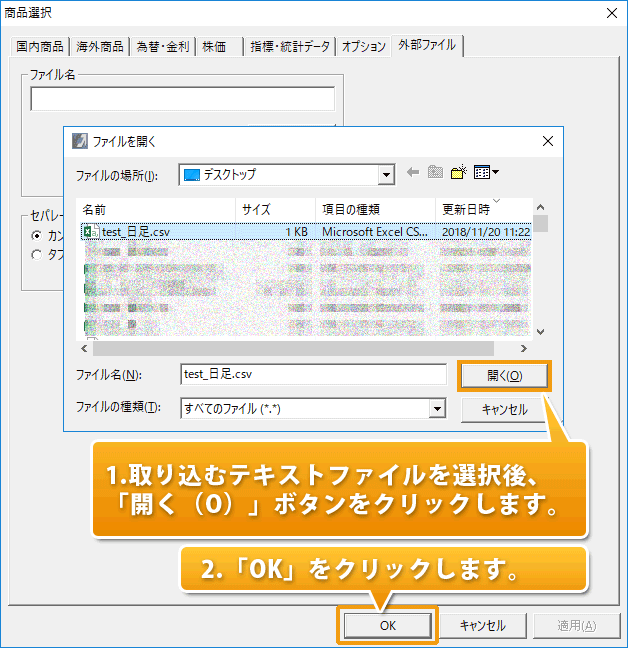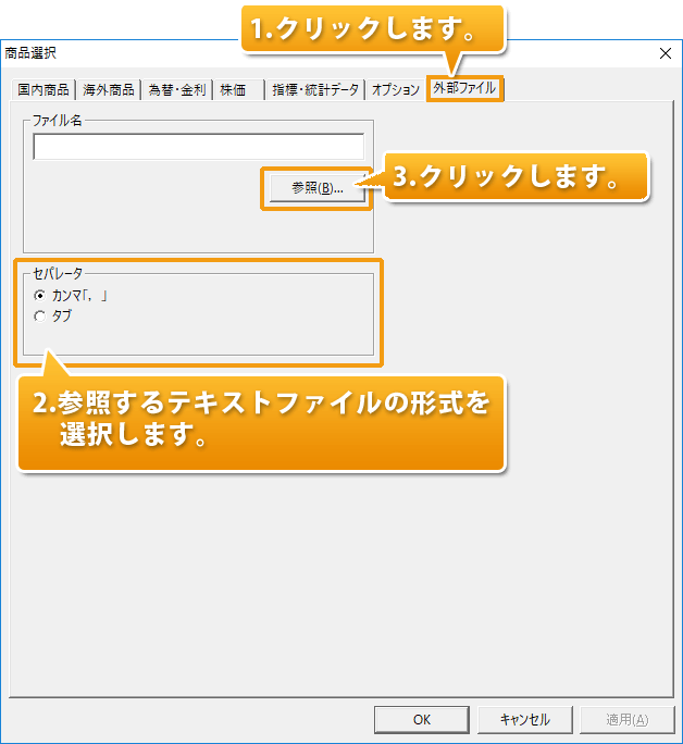 金や原油など商品に関連する企業の株価や経済指標等、お客様独自で収集したデータ【テキストファイル(.txt)もしくはCSVファイル(.csv)】の取り込みを行い、チャートを表示することが可能です。