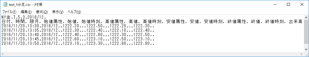 | n分足 | 7 | 日付,時間,限月,始値属性,始値,始値時刻,高値属性,高値,高値時刻,安値属性,安値,安値時刻,終値属性,終値,終値時刻,出来高 |