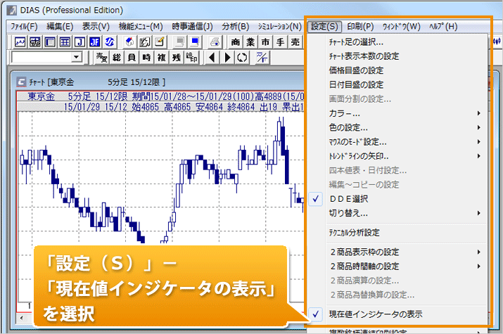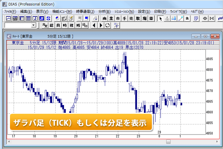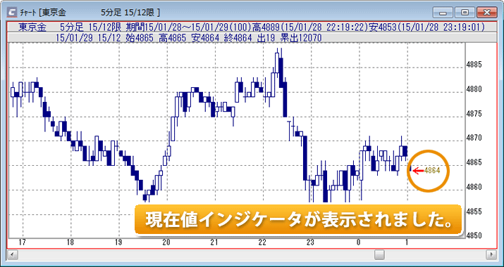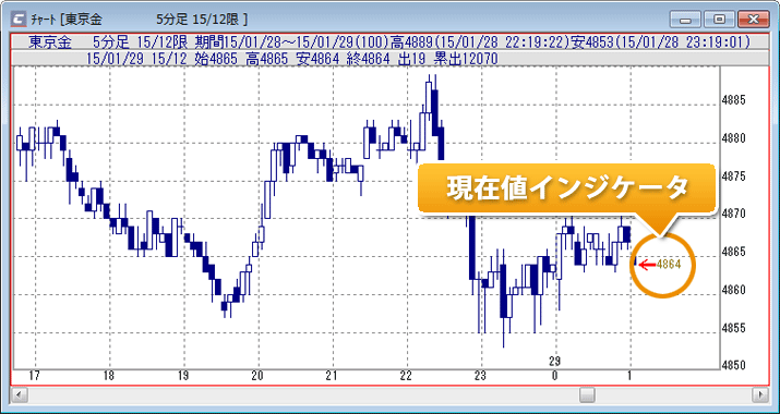 現在値インジケータは、ザラバ足(TICK)・分足で表示可能です。