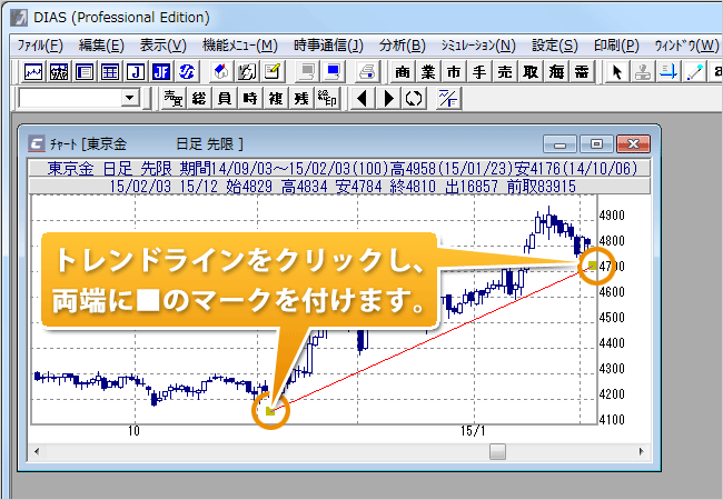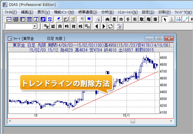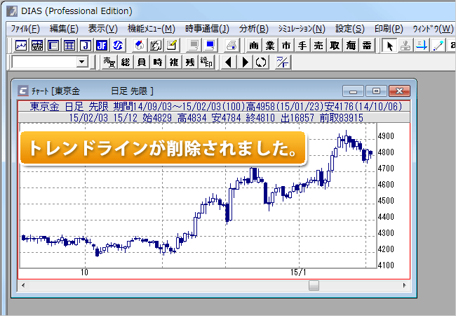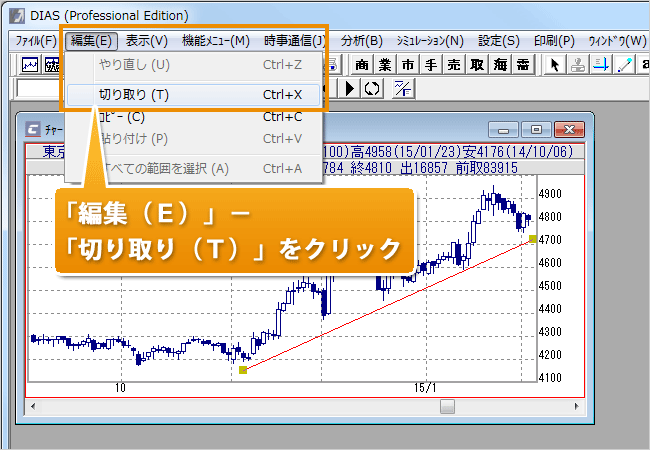 トレンドライン(編集:削除) STEP 1 トレンドラインの引き方についてはこちら STEP 2 STEP 3 キーボードの「ctrl(コントロール)」キーと「x(エックス)」キーの同時押しでも可。 STEP 4
