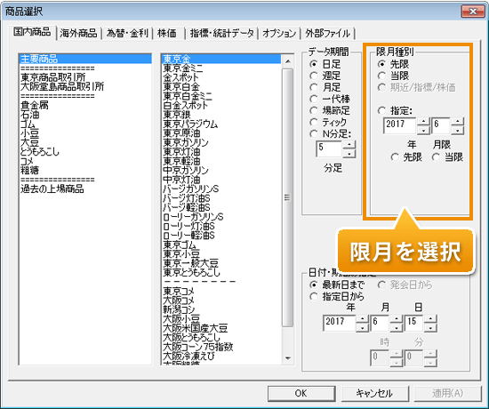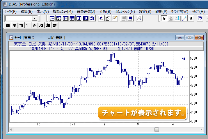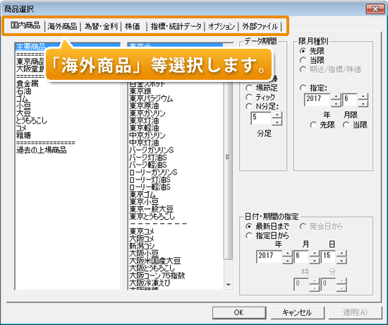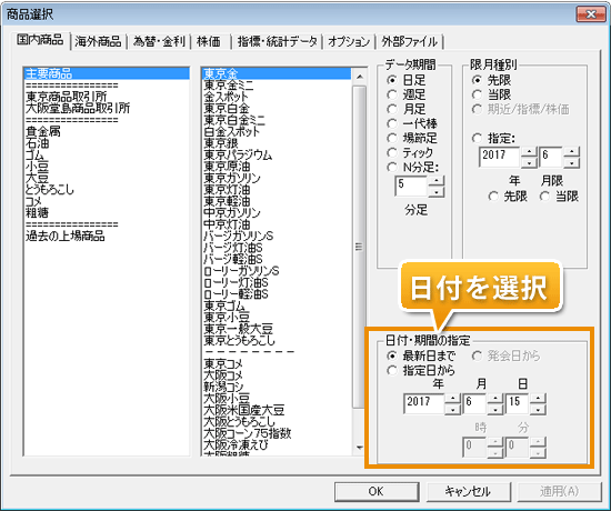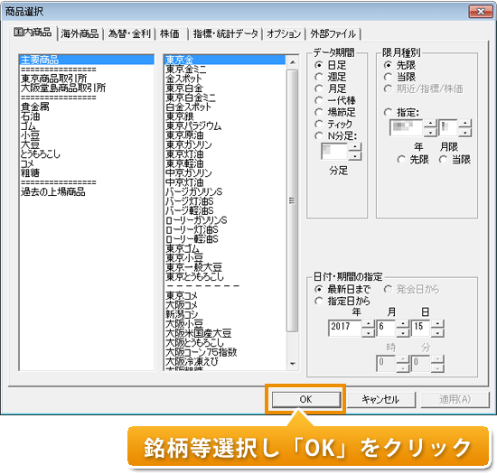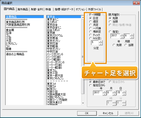 国内商品先物銘柄の他、海外商品先物銘柄や為替・スポット・株価指数等をチャート足(日足、分足等)の選択、限月の指定、データ期間の指定して表示することができます。