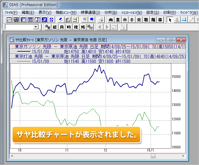 上図の青線はSTEP3で「東京ガソリン・東京原油」、緑線はSTEP5で「東京灯油・東京原油」の日足・先限を選択した場合の表示例です。