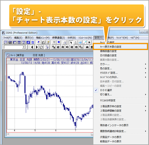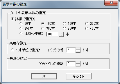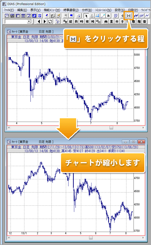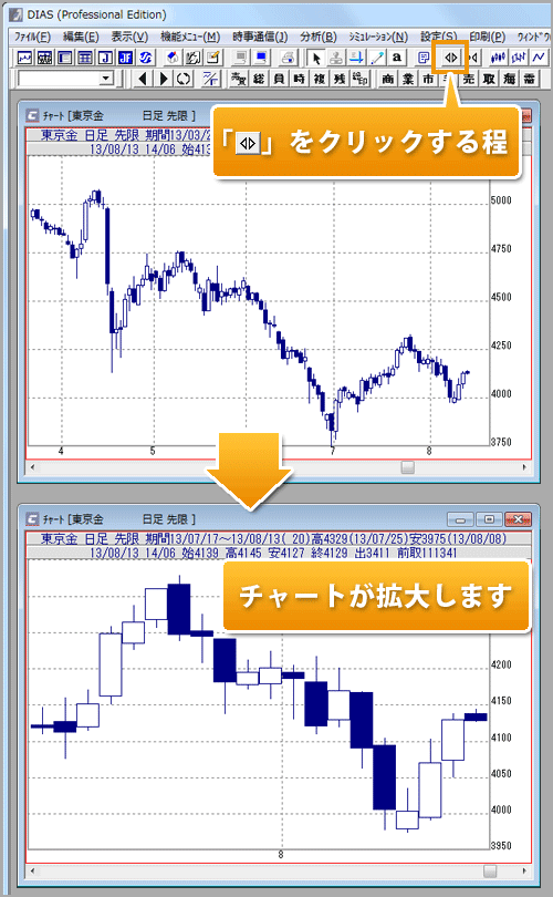 拡大・縮小 ローソク足の本数が少ないほど拡大され、本数が多いほど縮小されて表示されます。(チャートの本数:1~400本まで) 拡大する場合 縮小する場合 本数で指定する場合 本数が少ないほど拡大、また、本数が多いほど縮小します。
