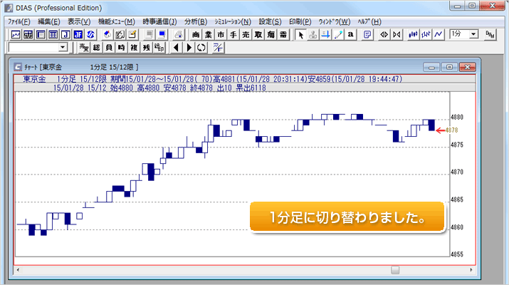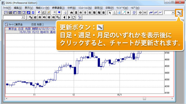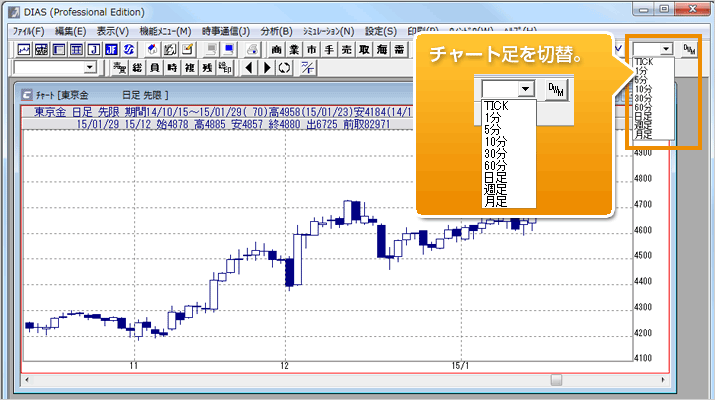 チャート期間(tick、分足、日足、週足、月足)を切り替えることができます。