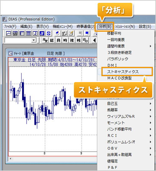 ここでは例として「ストキャスティクス」を選択しておりますが、他のテクニカル分析でも選択可能です。