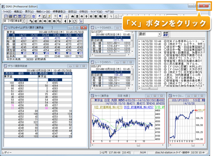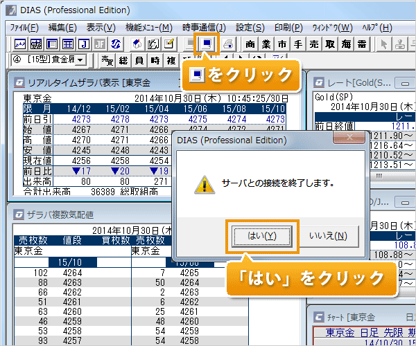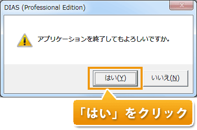 ログアウト方法 STEP 1 メニュー「ファイル(F)」-「DIASの終了(X)」でも可。 上図は、DIAS(Pro)のログアウト及び、DIAS(Pro)を終了する場合の操作です。 DIAS(Pro)を終了せずに、オンラインからオフライン状態へと移行する場合の操作について メニュー「ファイル(F)」-「サーバーから切断(D)」でも可。 STEP 2
