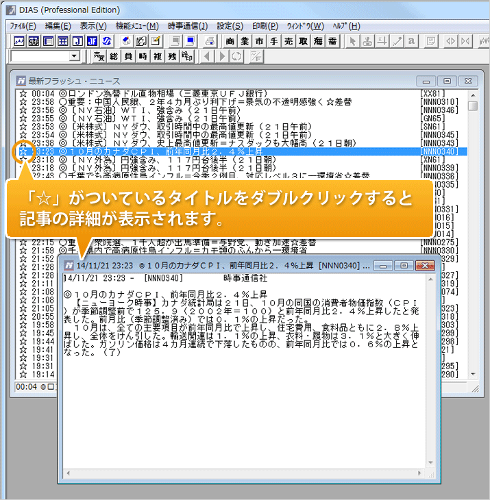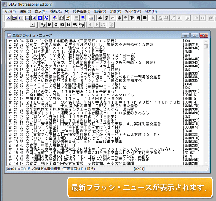 メニュー「機能メニュー(M)」-「フラッシュニュース(F)」でも可。
