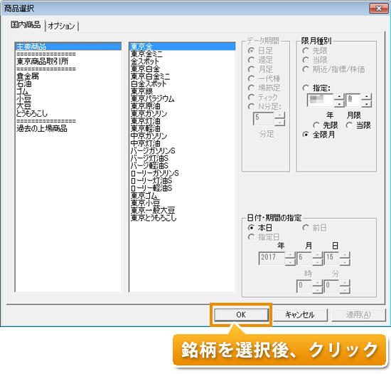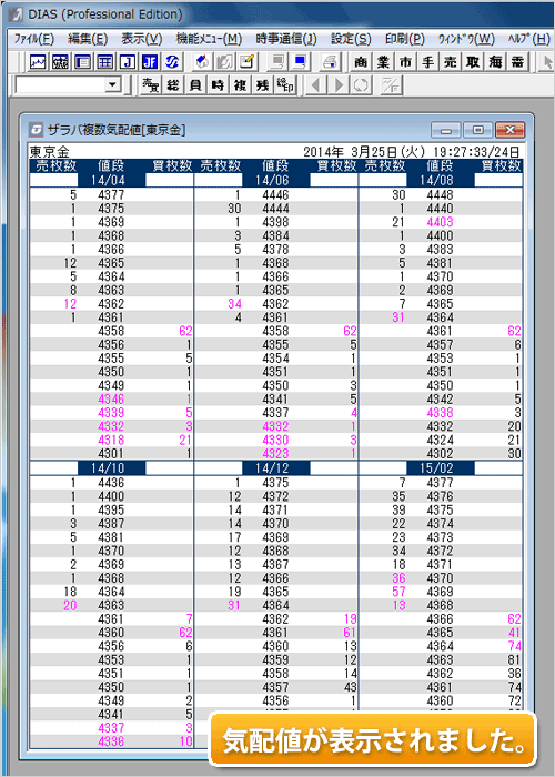 気配値表の1銘柄・全限月表示 1銘柄全限月の気配値表を表示します。 特定の銘柄と限月のみ気配値表を表示する場合はこちら STEP 1 メニュー「機能メニュー(M)」-「ザラバ気配値表...」でも可。 STEP 2 オプションの気配値表を表示させる場合はこちら STEP 3