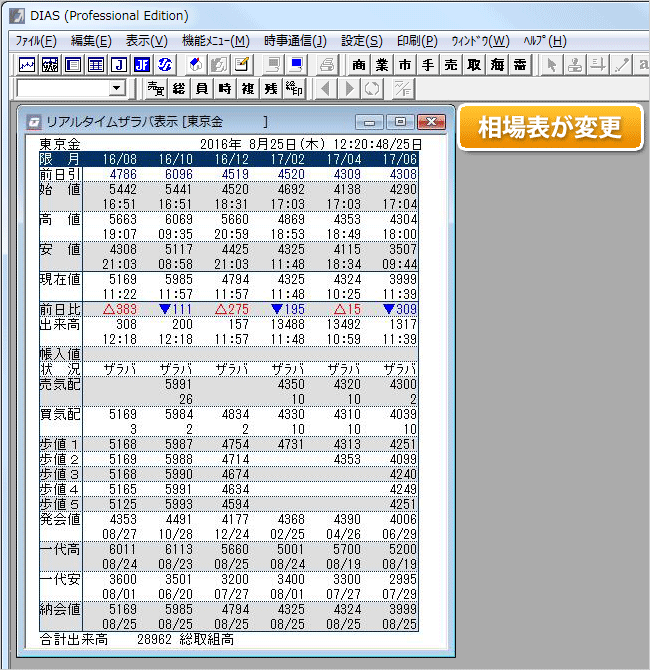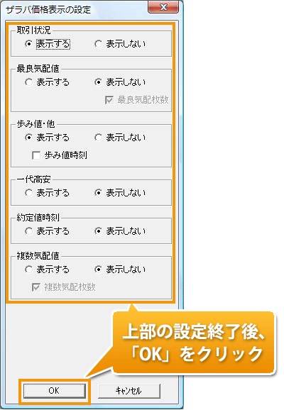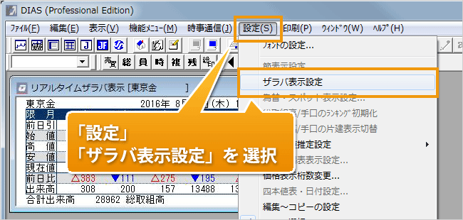 相場表の表示設定 相場表に、サーキットブレーカーや気配値等の表示の有無を設定できます。 STEP 1 相場表の表示方法についてはこちら STEP 2 板寄せ銘柄の場合、メニュー「設定(S)」-「節表示設定」を選択 STEP 3 STEP 4 上図は、STEP3で複数気配値以外全て「表示する」に設定した例です。