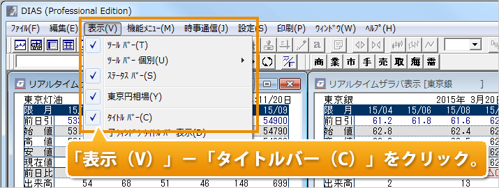 再度、メニュー「表示(V)」-「タイトルバー(C)」をクリックすると、タイトルバーが表示されます。