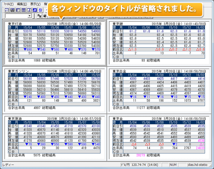 タイトルバーを消すことにより、相場表やチャート表示領域に余裕ができます。
