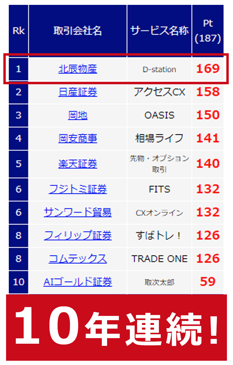 このたび、民間調査会社キャピタル・エフによる国内商品先物オンライン取引の最新サービス内容調査(2021年12月19日発表)におきまして、北辰物産オンライン取引「D-station」が10年連続で総合ランキング第1位の評価をされました。