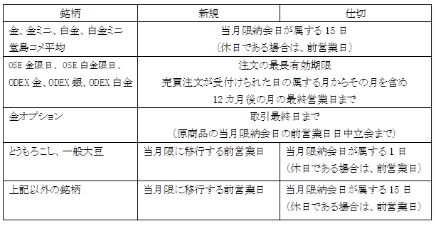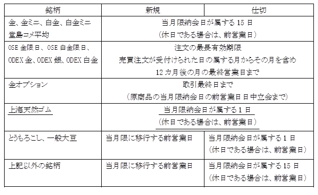 【新設】 【以下、項ずれ】 ※ 差金決済について、「貴金属(金オプションを除く)」、「ゴム」、「小豆」にあっては、当月限納会日の属する月の15日(休日である場合は前営業日)の日中立会終了まで、「CME 原油等指数」にあっては、納会月前月の 15 日(休日である場合は前営業日)の日中立会まで、「とうもろこし」、「一般大豆」にあっては、当月限納会日の属する月の1 日(休日である場合は前営業日)の日中立会終了までが取引期限となります。 |
