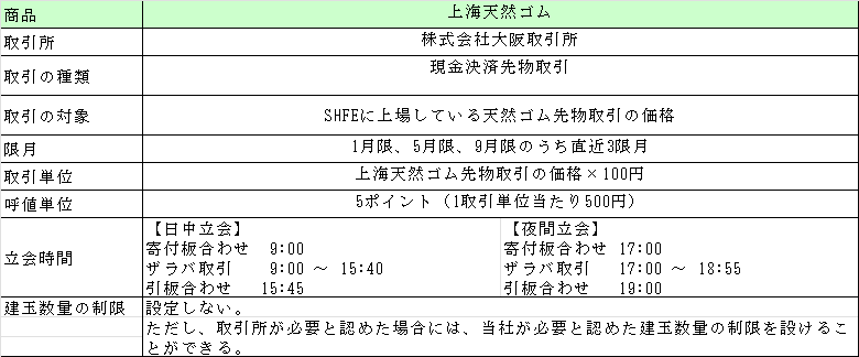 F 上海天然ゴム先物取引 1月、5月及び9月の15日(SHFEに上場している天然ゴム先物の受渡値段が算出されない日に当たるときは、順次繰り下げ。また、15日(又は繰り下げた日)が休業日に当たるときは、順次繰り上げ。) 【以下、項ずれ】 ※ 差金決済について、「貴金属(金オプションを除く)」、「ゴムRSS3」、「ゴムTSR20」、「小豆」にあっては、当月限納会日の属する月の15日(休日である場合は前営業日)の日中立会終了まで、「CME 原油等指数」にあっては、納会月前月の 15 日(休日である場合は前営業日)の日中立会まで、「上海天然ゴム」、「とうもろこし」、「一般大豆」にあっては、当月限納会日の属する月の1 日(休日である場合は前営業日)の日中立会終了までが取引期限となります。 |