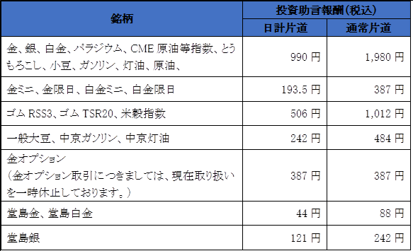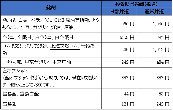 本システムをご利用の売買取引の委託手数料は別紙「証拠金/手数料一覧」に定める金額とします。 取引所ザラバ取引の日計り取引は、1計算区域内(前日の夜間立会(17:00~翌6:00 ※ゴムRSS3、ゴムTSR20、上海天然ゴムは17:00~19:00)+当日日中立会(8:45~15:45 ※ゴムRSS3、ゴムTSR20、上海天然ゴムは9:00~15:45、ODEX堂島米穀指数は朝8:45~15:45))を対象とします。※祝日取引がある場合には、祝日取引の日中立会および夜間立会も1計算区域内に含まれます。尚、ODEX堂島貴金属市場は祝日取引、米穀指数は夜間立会・祝日取引を行いません。 オプション取引では、建玉時、決済時および権利行使・割当時に委託手数料が取引口座より控除されます。 |