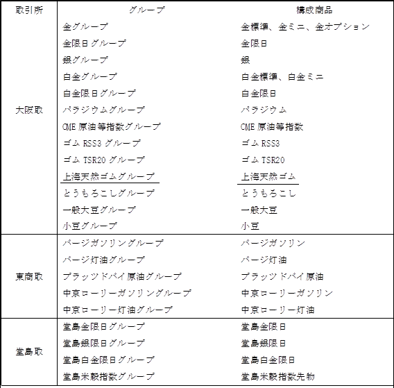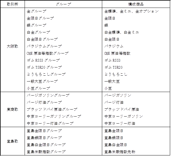 株式会社大阪取引所(以下、「OSE」という。) (金標準、金ミニ、金限日、金オプション、銀、白金標準、白金ミニ、白金限日、パラジウム、CME原油等指数、ゴムRSS3、ゴムTSR20、とうもろこし、一般大豆、小豆) (以下、省略) |