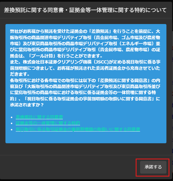 尚、本件の対応に伴い、大変お手数ではございますが、お客様には同意手続きを行っていただく必要がございます。 2026年2月10日、日中立会終了時にお取引ツールのログイン画面に掲載いたしますので、内容をよくご確認いただいたうえで、お手続きを行っていただきますよう、宜しくお願い申し上げます。