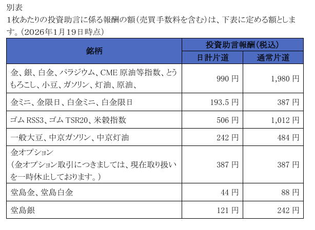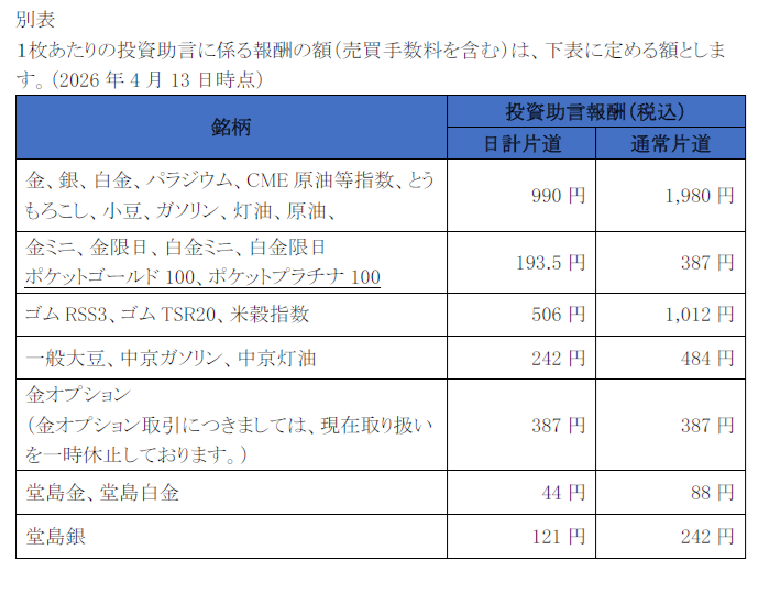 この度、令和8年4月13日付けで「契約締結前交付書面」、「契約締結前交付書面(別紙 委託者証拠金について)」「投資顧問契約締結時交付書面 兼 投資顧問契約書」、「特定の電子取引に関する運用規定」および「先物・オプション取引口座設定約諾書」(以下、「交付書面」といいます。)を一部改定いたします。
