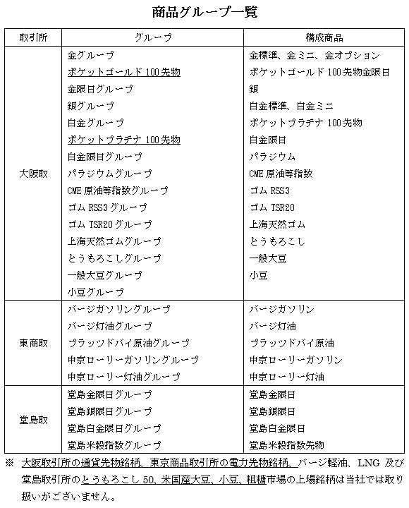 株式会社大阪取引所(以下、「OSE」という。) (金標準、金ミニ、ポケットゴールド100、金限日、金オプション、銀、白金標準、白金ミニ、ポケットプラチナ100、白金限日、パラジウム、CME原油等指数、ゴムRSS3、ゴムTSR20、上海天然ゴム、とうもろこし、一般大豆、小豆) (以下変更なし) |