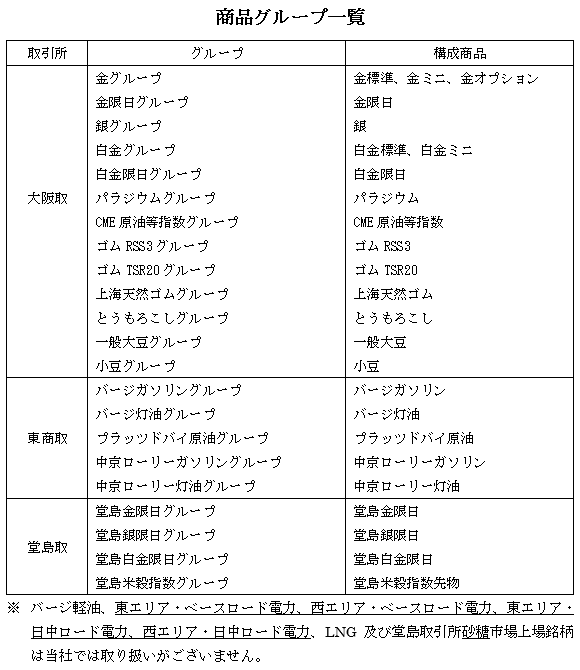 株式会社大阪取引所(以下、「OSE」という。) (金標準、金ミニ、金限日、金オプション、銀、白金標準、白金ミニ、白金限日、パラジウム、CME原油等指数、ゴムRSS3、ゴムTSR20、上海天然ゴム、とうもろこし、一般大豆、小豆) (省略) |