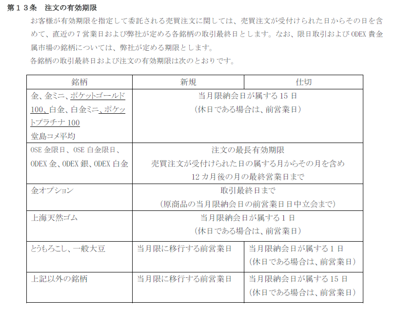 (省略) (新設) (省略) ※ 金、金ミニおよび白金、白金ミニにつきましては、納会月15日(休日である場合は前営業日。)まで新規建玉ができます。 (省略) |