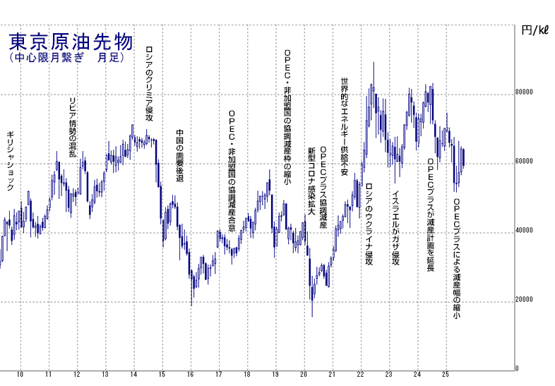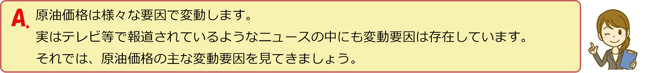 上記の2例は、ガソリン、灯油の主な需要面での変動要因ですが、供給面から見た場合の主要な価格変動要因としては、原油価格の動向が挙げられます。これらは原油から精製されているため、原油価格が上昇すると高く、下落すると安くなる傾向にあります。
