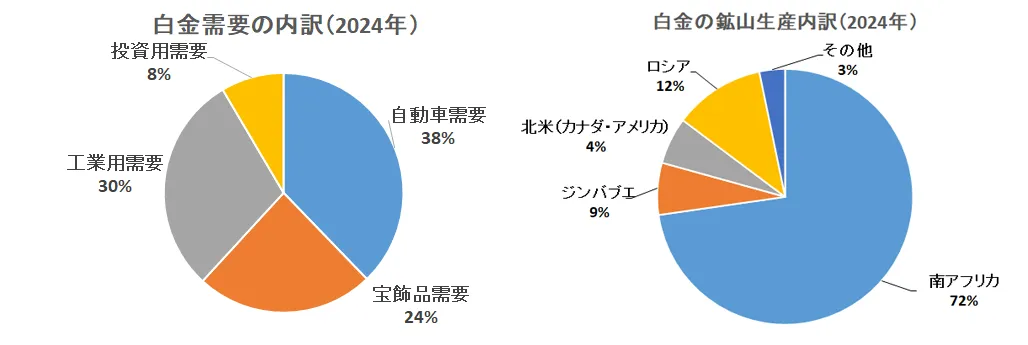 2024年における白金の需要比率は多い順から自動車需要が約38%、工業需要が約30%、宝飾品需要が約24%、投資需要が約8%となっています。