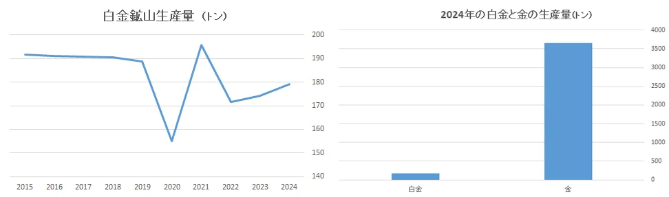 また、近年においても2024年の白金の生産量は年間179.3トンで、同年の金の生産量3661.2トンに比べて非常に少ない水準となっています。