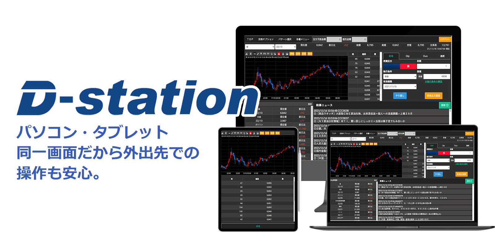 D-stationは、タブレット端末・パソコンの双方に対応した取引ツールです。ご自宅ではPC、外出時はタブレットといった具合に様々なシーンでのトレードに対応可能で、いつでもどこでも気軽にお取引いただけます。