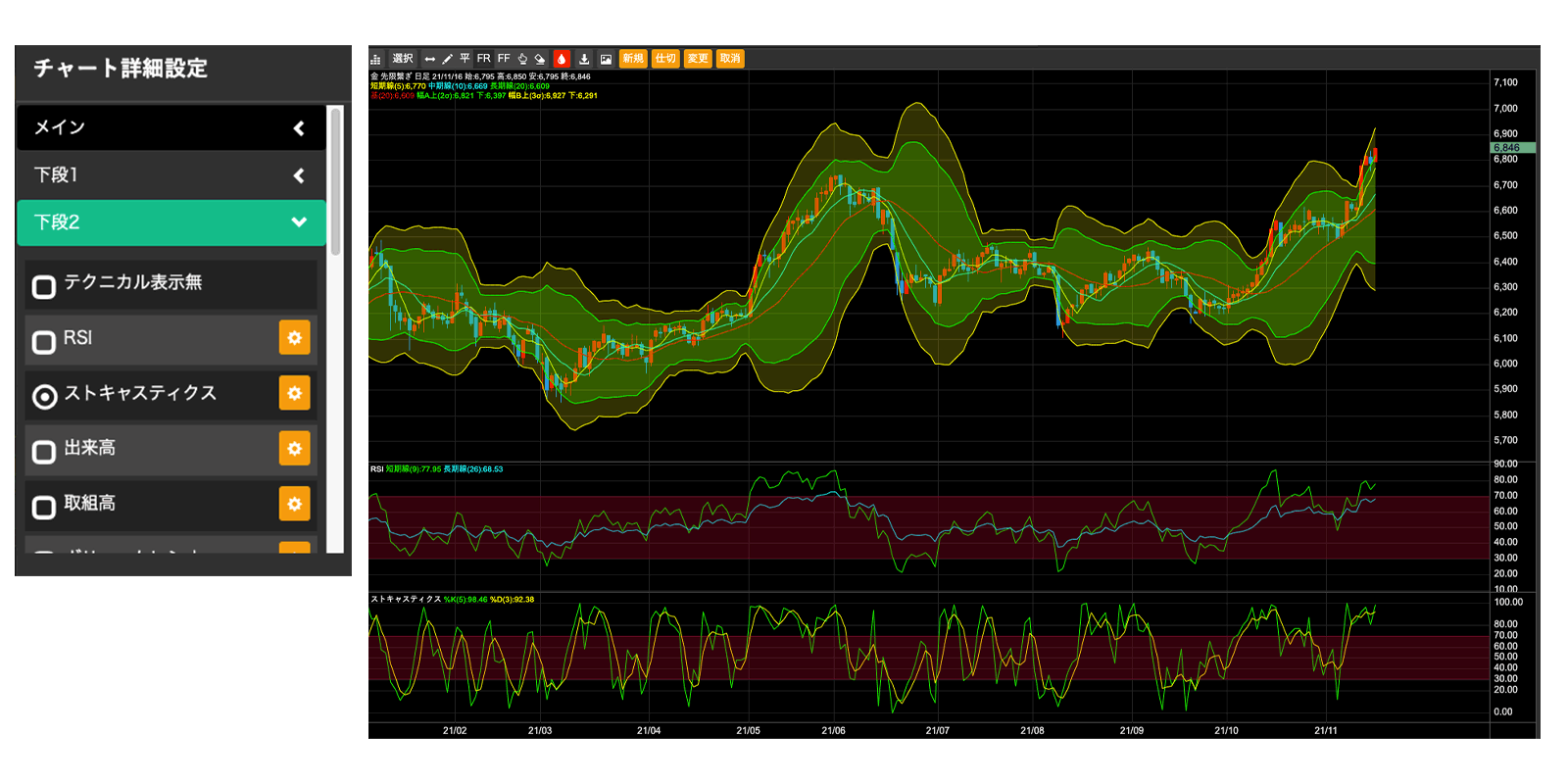 それぞれのテクニカル指標の設定値は、お好みに合わせて設定を変更することができます。また下記の指標のほか、チャートにはトレンドラインも搭載しております。