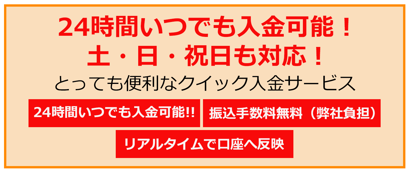 金融機関の窓口、ATM等からのお振込みではご利用いただけません。 - クイック入金サービスは、1万円からの受付とさせていただきます。